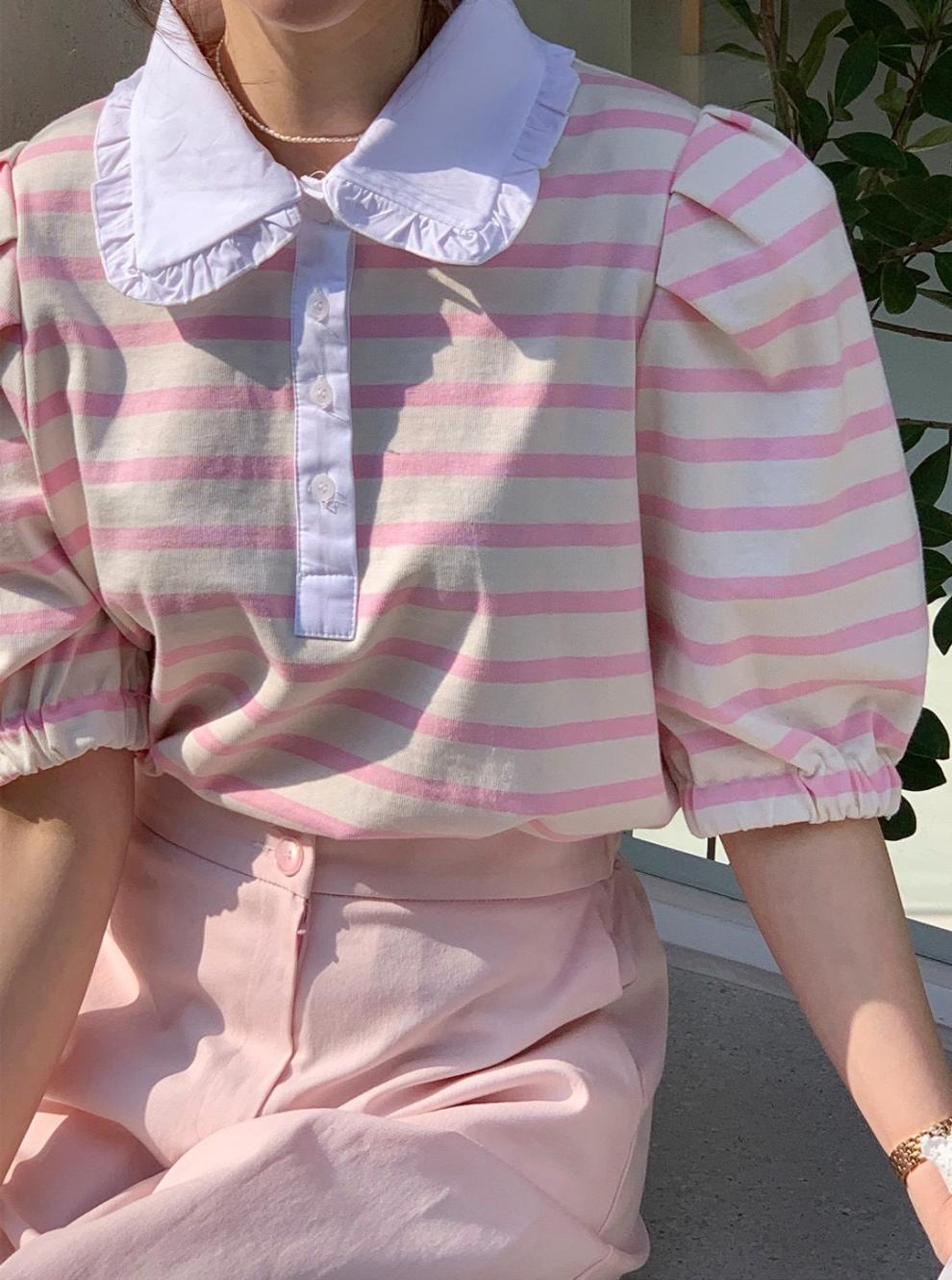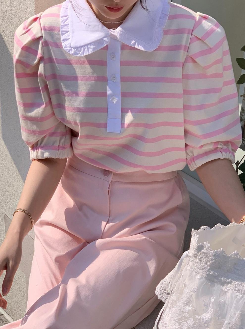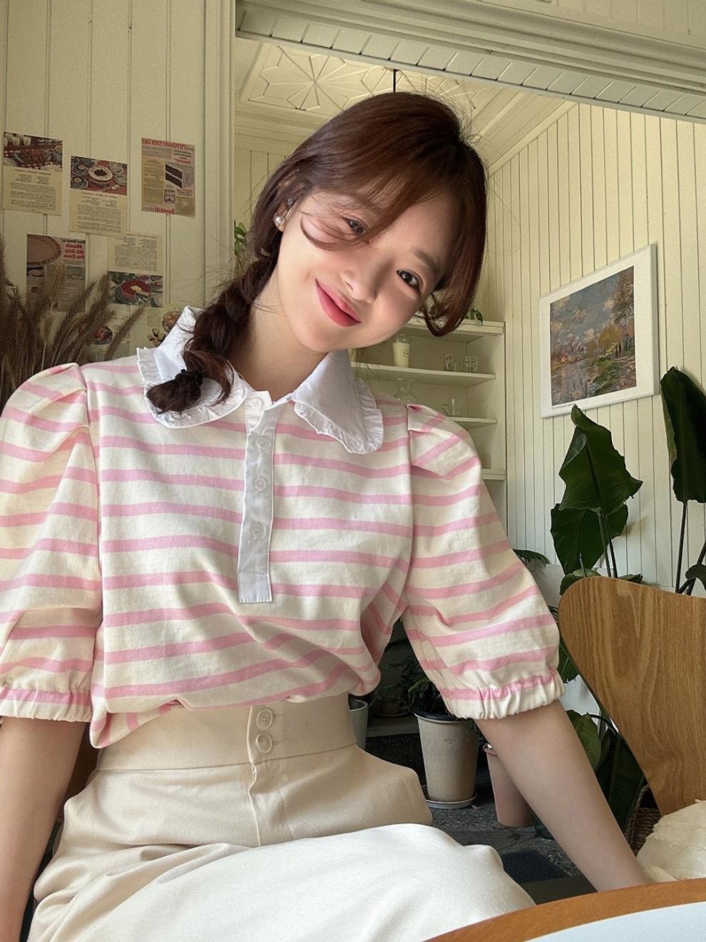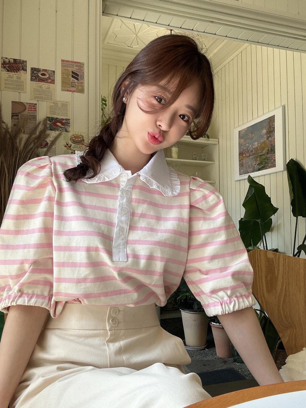 Youthful And Elegant POLO-collar Design Loose-fitting Versatile Short-sleeve Striped T-shirt