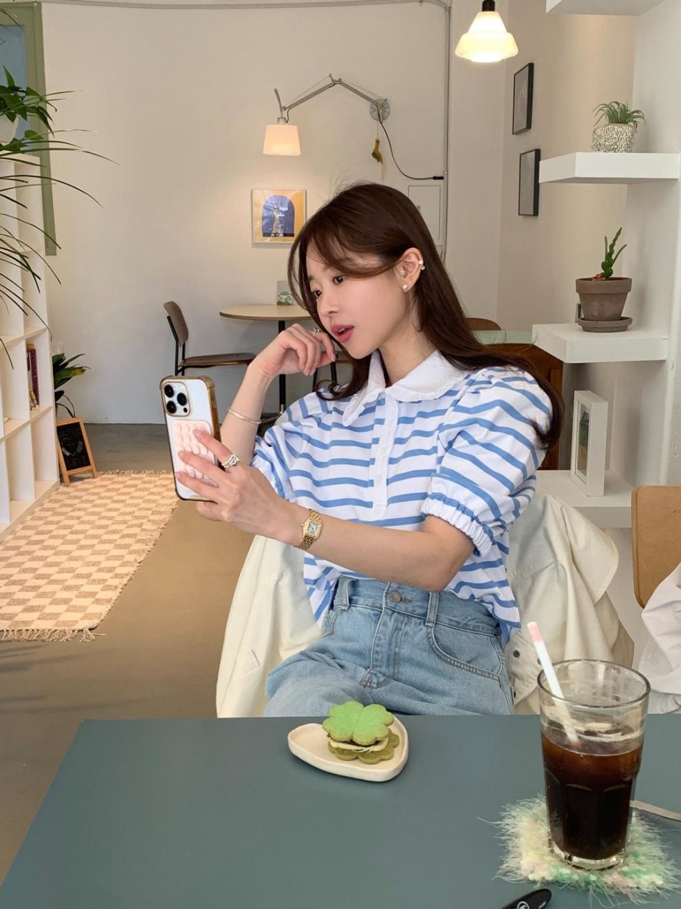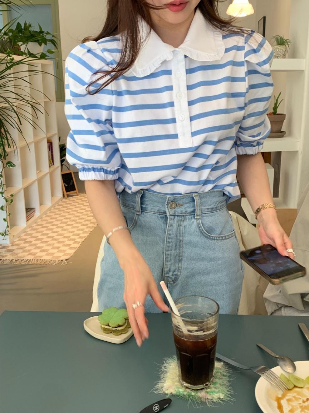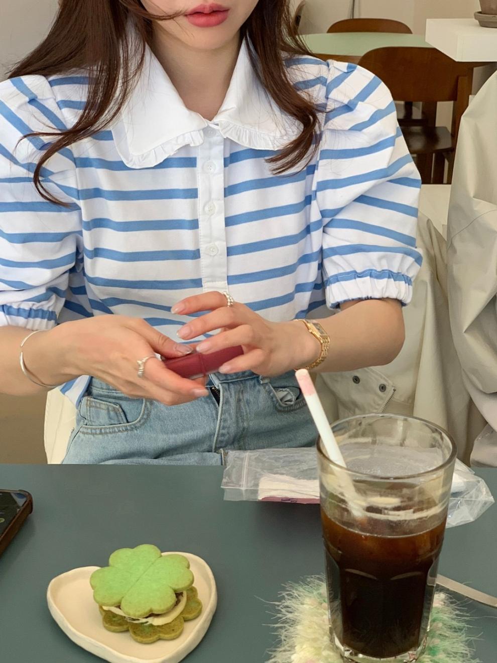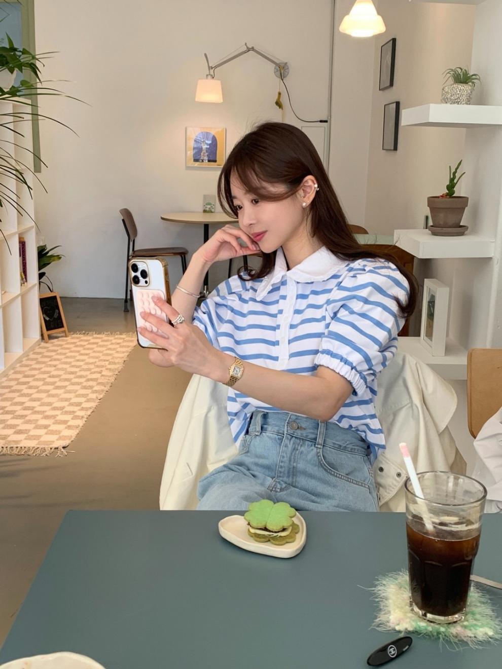 Youthful And Elegant POLO-collar Design Loose-fitting Versatile Short-sleeve Striped T-shirt