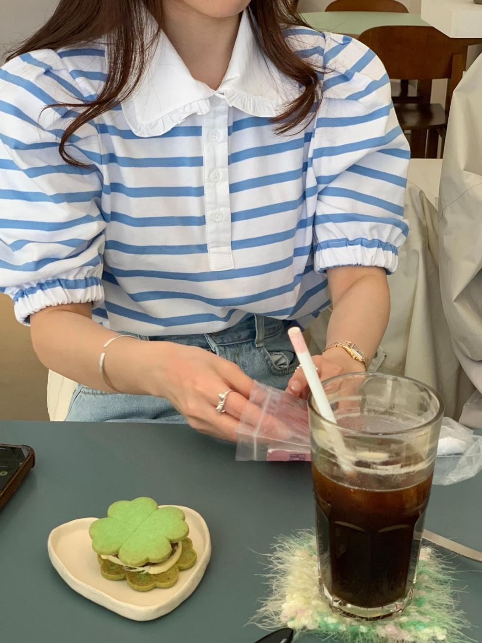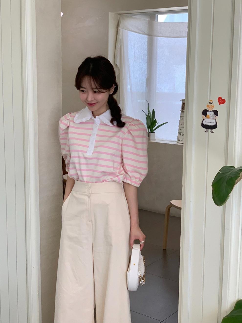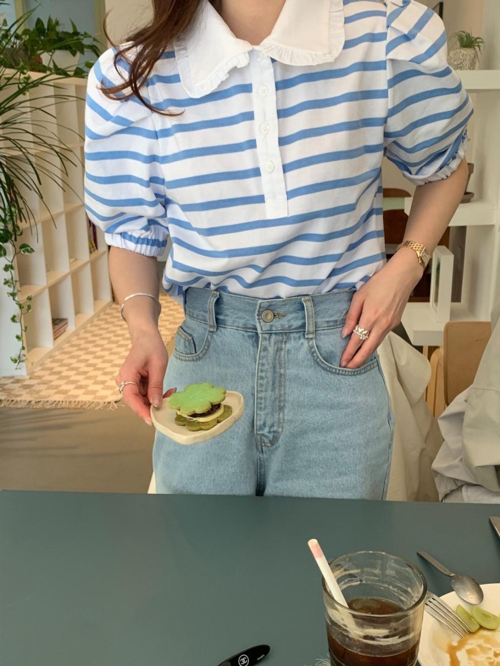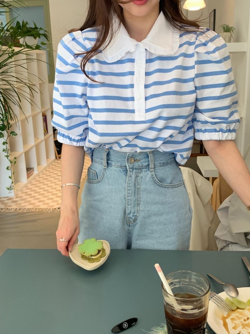 Youthful And Elegant POLO-collar Design Loose-fitting Versatile Short-sleeve Striped T-shirt